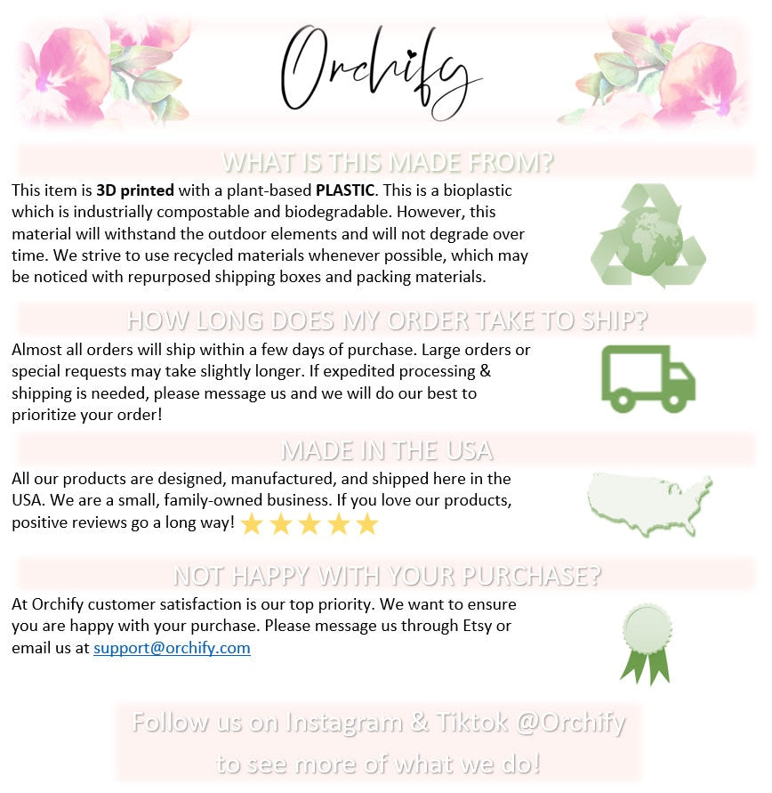 At Orchify we are passionate about environmental conservation. All of our products are 3D-printed from a bioplastic material, which is produced from renewable resources. Most shipping materials we use are recycled. All products are designed, printed, and shipped myself from the US.